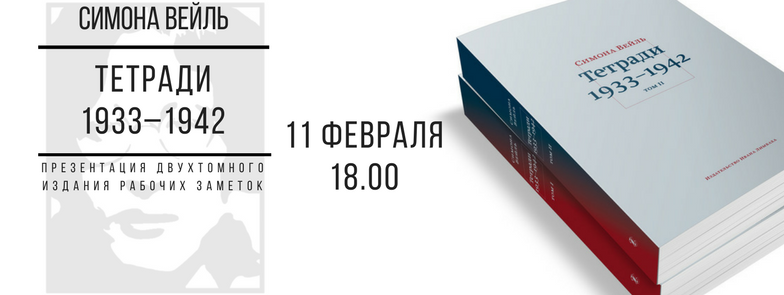 Двухтомное издание рабочих заметок французского философа и религиозного мыслителя Симоны Вейль «Тетради 1933–1942» представит переводчик Петр ЕПИФАНОВ. В вечере также примут участие Анна ШМАИНА-ВЕЛИКАНОВА и Наталья ЛИКВИНЦЕВА.