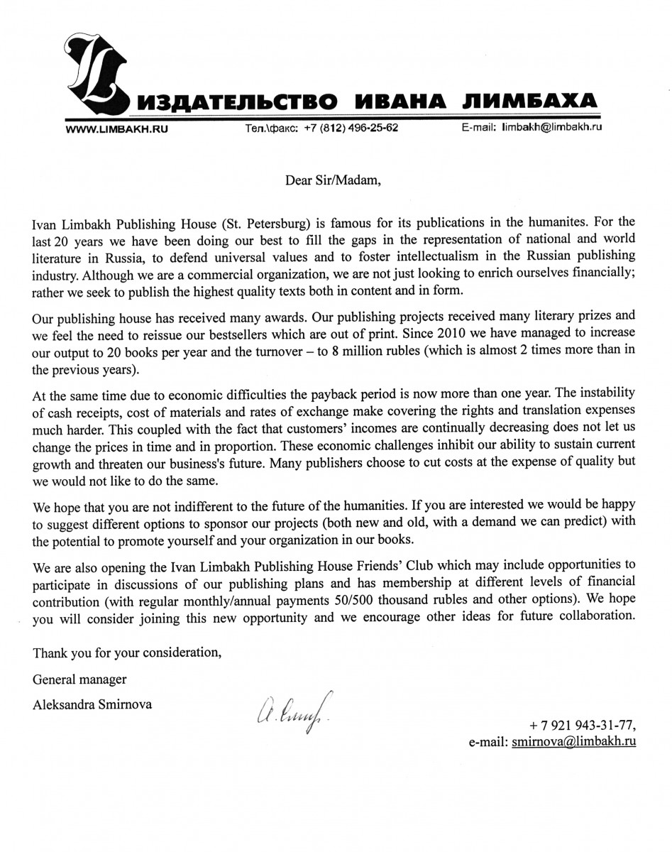 We would like to continue publishing important and exceptional works, organize memorable cultural events, contribute to the growth of Russian cultural life, and we need your support.
